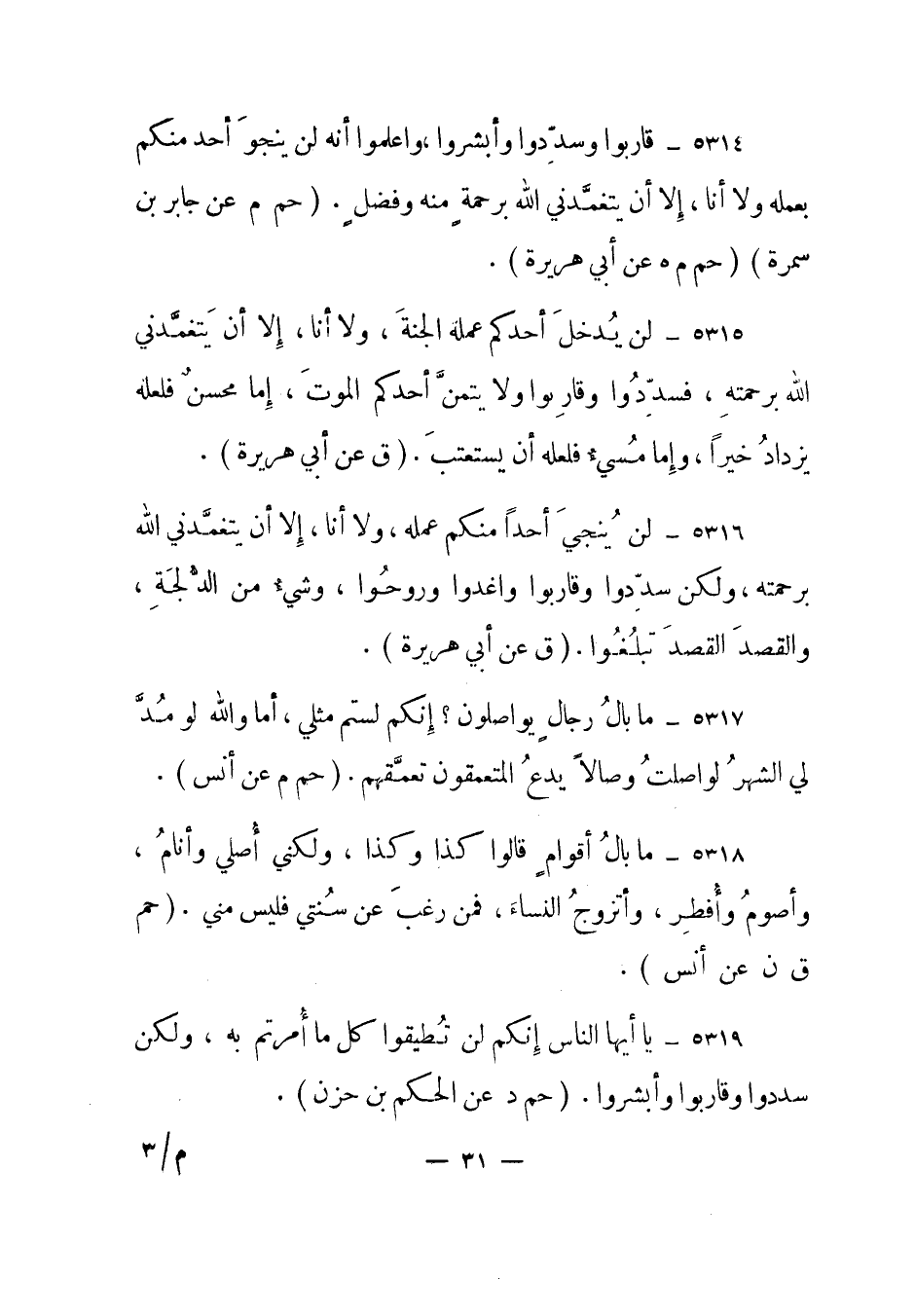5314- قاربوا وسددوا وأبشروا، واعلموا أنه لن ينجو أحد منكم بعمله ولا أنا، إلا أن يتغمدني الله برحمة منه وفض ل. "حم م عن جابر عن سمرة" "حم م هـ عن أبي هريرة".