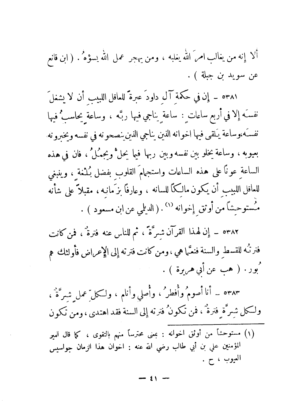 5381- إن في حكمة آل داود عبرة للعاقل اللبيب أن لا يشغل نفسه إلا في أربع ساعات: ساعة يناجي فيها ربه، وساعة يحاسب فيها نفسه، وساعة يلقى فيها إخوانه الذين يناجي الذين ينصحونه في نفسه ويخبرونه بعيوبه، وساعة يخلو بين نفسه وبين ربها فيما يحل ويجمل، فإن في هذه الساعة عونا على هذه الساعات واستجمام القلوب بفضل بلغة، وينبغي للعاقل اللبيب أن يكون مالكا للسانه، وعارفا بزمانه، مقبلا على شأنه مستوحشا من أوثق إخوانه 1 "الديلمي عن ابن مسعود".