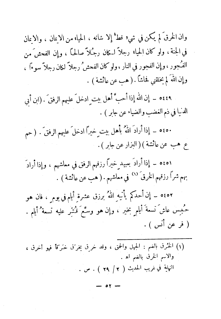 5451- إذا أراد بعبيد خيرا رزقهم الرفق في معاشهم، وإذا أراد بهم شرا رزقهم الخرق1 في معاشهم."هب عن عائشة".