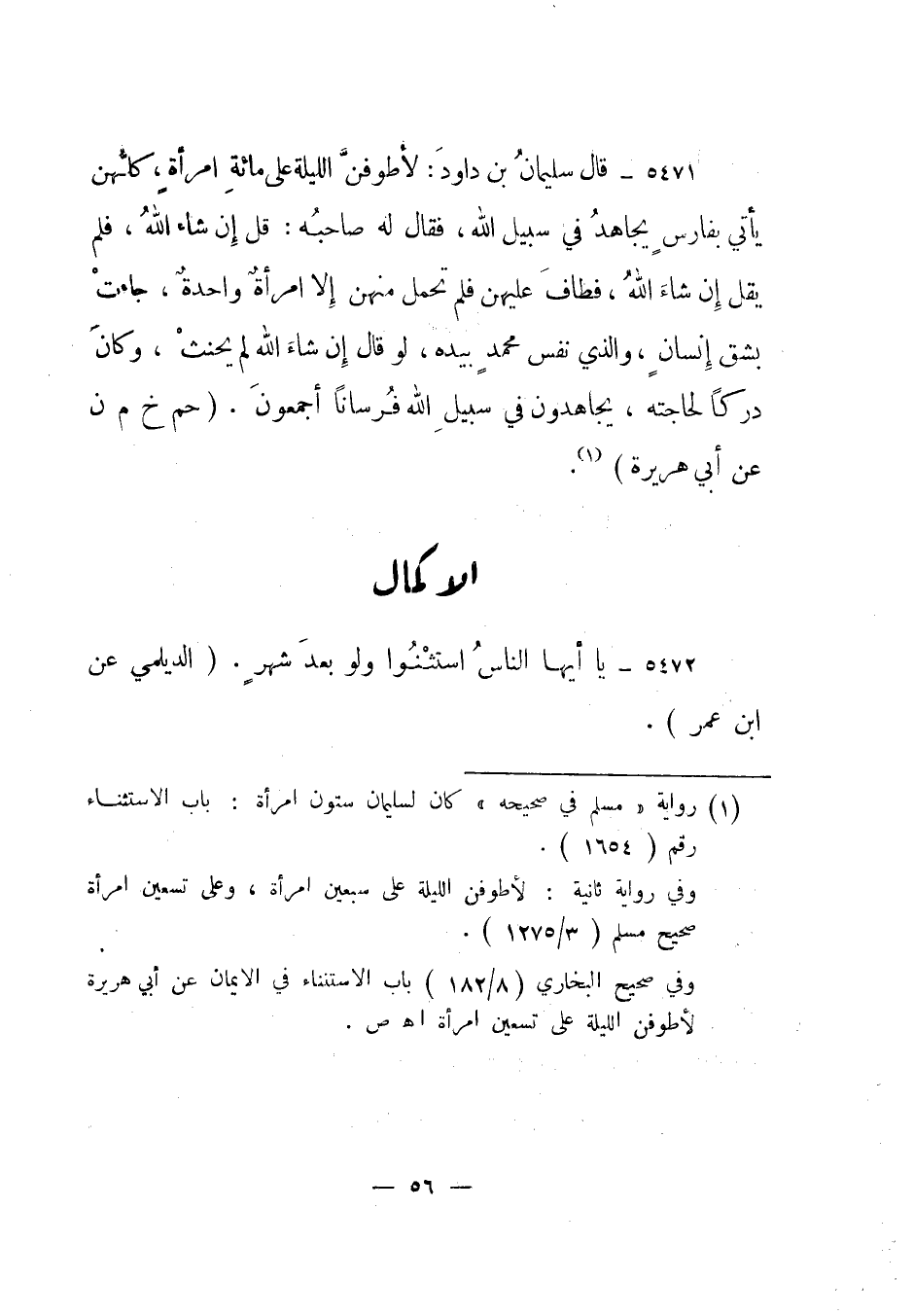 1 رواية مسلم في صحيحه" كان لسليمان ستون امرأة: باب الاستثناء رقم "1654".