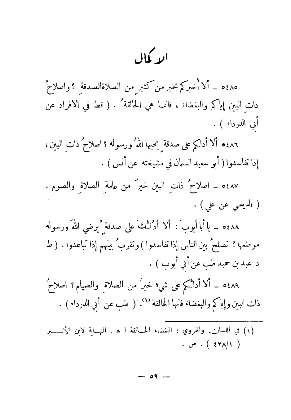 5489- ألا أدلكم على شيء خير من الصلاة والصيام؟ إصلاح ذات البين وإياكم والبغضاء فإنها الحالقة 1. "طب" عن أبي الدرداء".