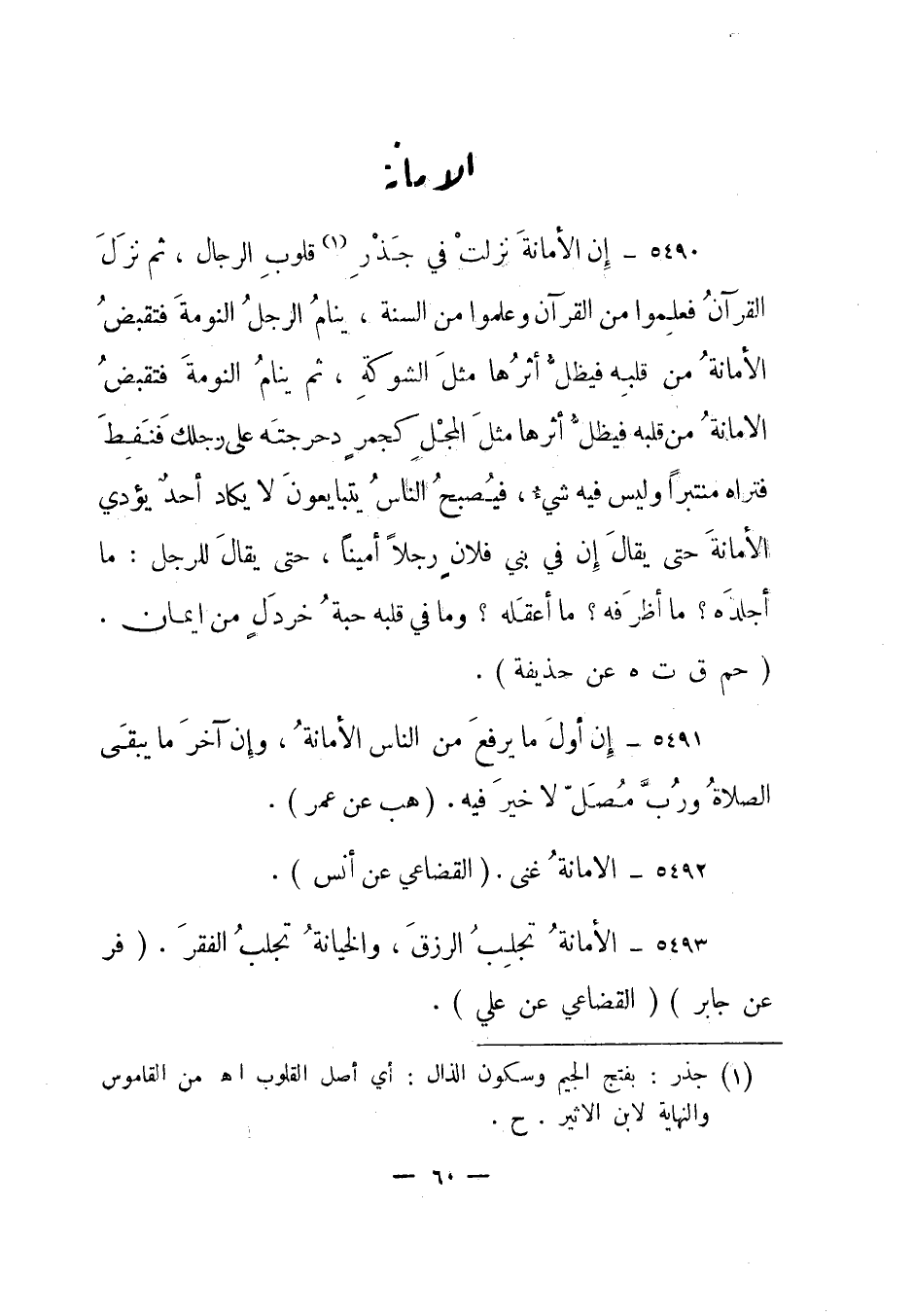 5490- إن الأمانة نزلت في جذر1 قلوب الرجال، ثم نزل القرآن فعلموا من القرآن وعلموا من السنة، ينام الرجل النومة فتقبض الأمانة من قلبه فيظل أثرها مثل الشوكة، ثم ينام النومة فتقبض الأمانة من قلبه فيظل أثرها مثل المجل كجمر دحرجته على رجلك فنفط فتراه منتبرا وليس فيه شيء، فيصبح الناس يتبايعون لا يكاد أحد يؤدي الأمانة حتى يقال: إن في بني فلان رجلا أمينا، حتى يقال للرجل: ما أجلده؟ ما أظرفه؟ ما أعقله؟ وما في قلبه حبة خردل من إيمان. "حم ق ت هـ عن حذيفة".