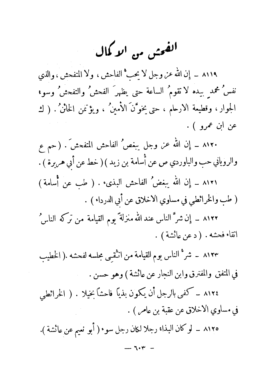 8123- شر الناس يوم القيامة من اتقي مجلسه لفحشه. الخطيب في المتفق والمفترق وابن النجار عن عائشة وهو حسن.