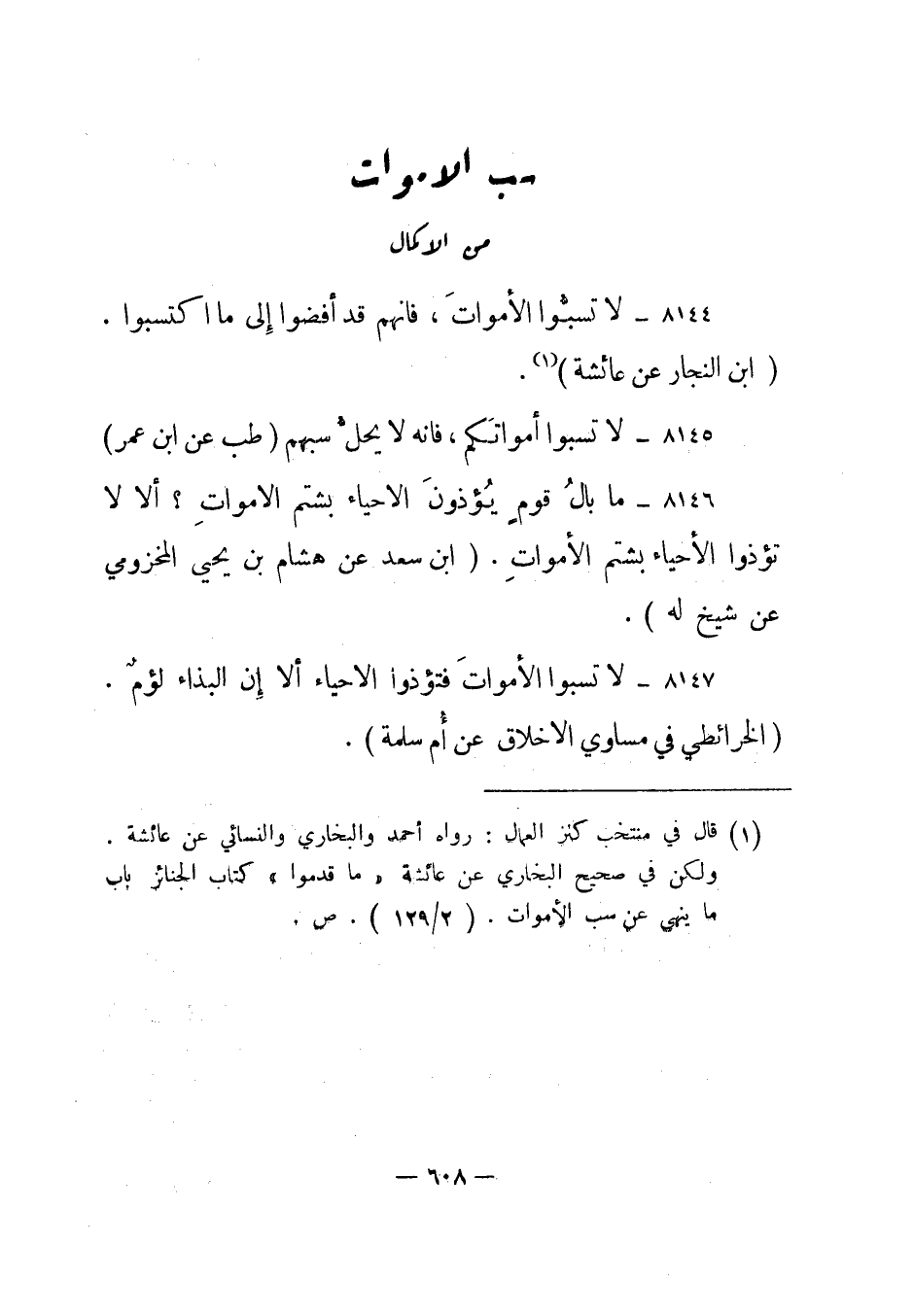 8144- لا تسبوا الأموات، فإنهم قد أفضوا إلى ما اكتسبوا. ابن النجار عن عائشة1.