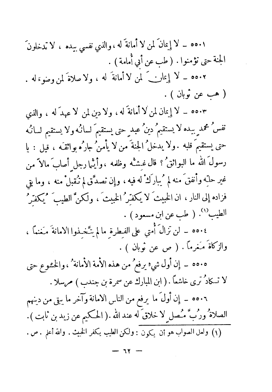 5502- لا إيمان لمن لا أمانة له، ولا صلاة لمن لا وضوء له. "هب عن ثوبان".