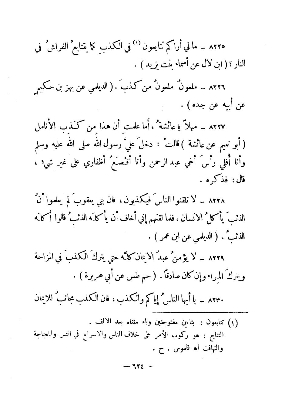 8225- ما لي أراكم تتايعون1 في الكذب كما يتتايع الفراش في النار؟ ابن لال عن أسماء بنت يزيد.