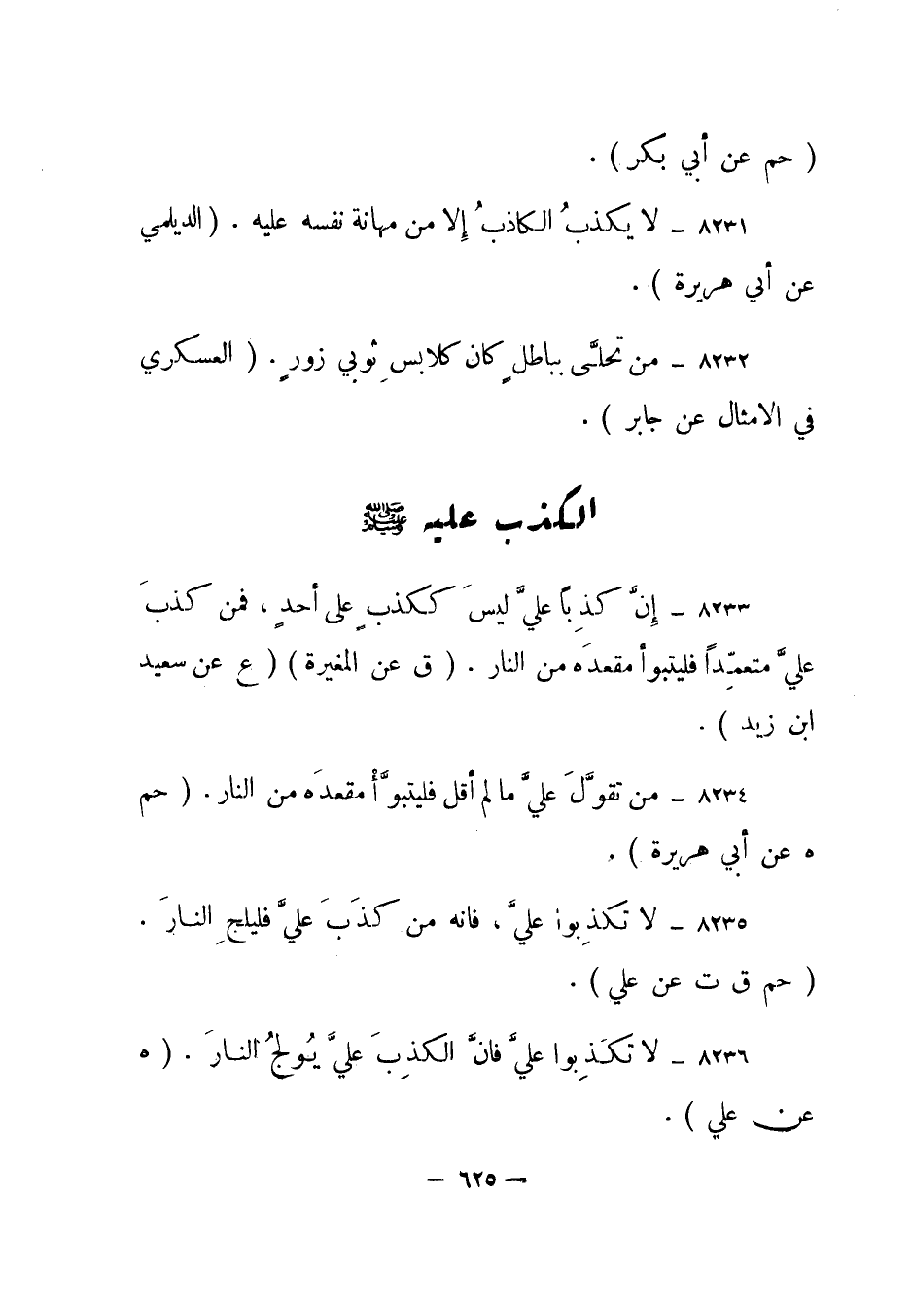 8233- إن كذبا علي ليس ككذب على أحد، فمن كذب علي متعمدا فليتبوأ مقعده من النار. "ق" عن المغيرة "ع" عن سعيد بن زيد.