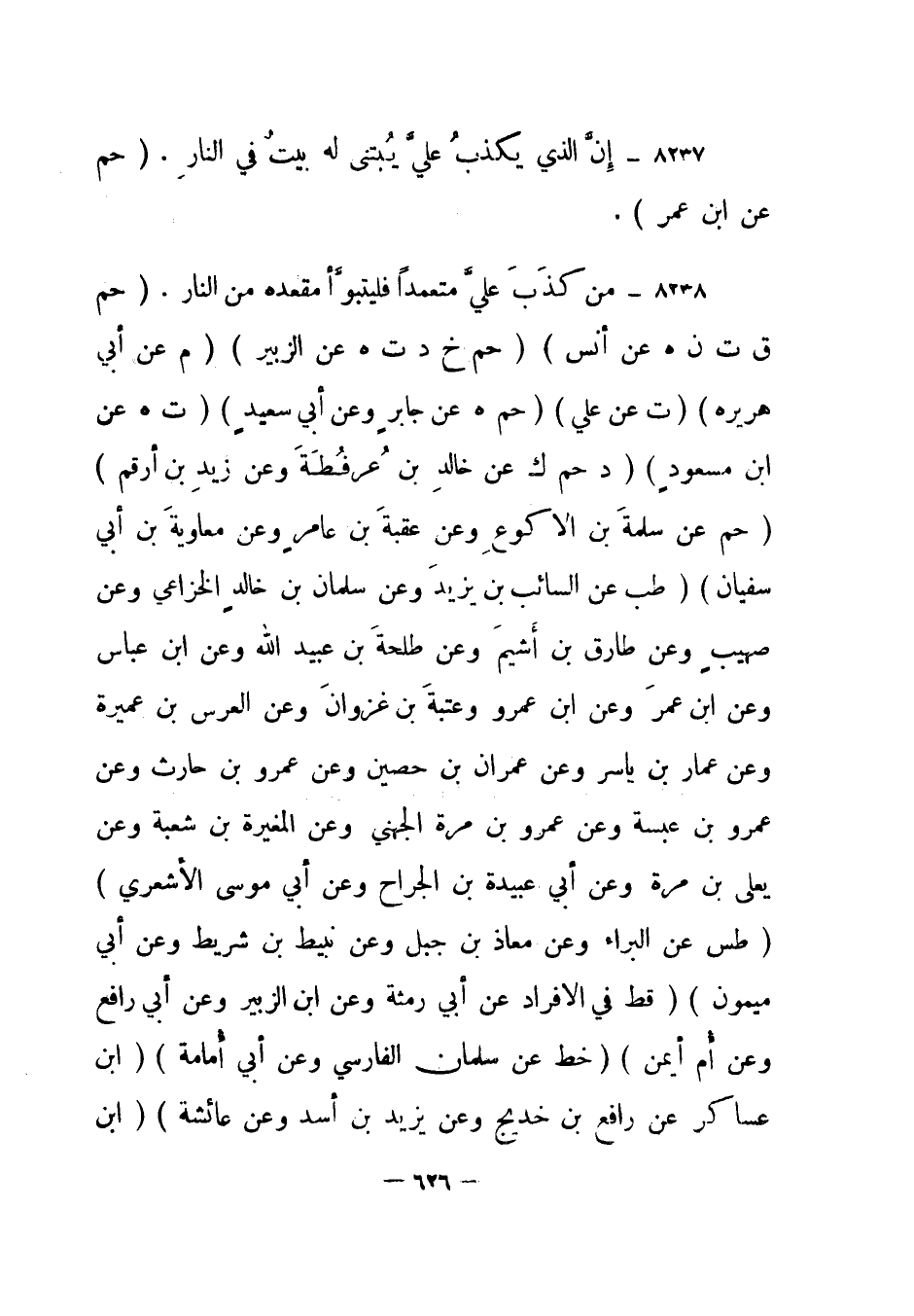 8238- من كذب علي متعمدا فليتبوأ مقعده من النار. "حم ق ت ن هـ" عن أنس "حم خ د ت هـ" عن الزبير "م" عن أبي هريرة "ت" عن علي "حم هـ" عن جابر وعن أبي سعيد "ت هـ" عن ابن مسعود "د حم ك" عن خالد بن عرفطة وعن زيد بن أرقم "حم" عن سلمة بن الأكوع وعن عقبة بن عامر وعن معاوية بن أبي سفيان "طب" عن السائب بن يزيد وعن سلمان بن خالد الخزاعي وعن صهيب وعن طارق بن أشيم وعن طلحة بن عبيد الله وعن ابن عباس وعن ابن عمر وعن ابن عمرو وعتبة بن غزوان وعن العرس بن عميرة وعن عمار بن ياسر وعن عمران بن حصين وعن عمرو بن حارث وعن عمرو بن عبسة وعن عمرو بن مرة الجهني وعن المغيرة بن شعبة وعن يعلى بن مرة وعن أبي عبيدة بن الجراح وعن أبي موسى الأشعري "طس" عن البراء وعن معاذ بن جبل وعن نبيط بن شريط وعن أبي ميمون "قط" في الأفراد عن أبي رمثة وعن ابن الزبير وعن أبي رافع وعن أم أيمن "خط" عن سلمان الفارسي وعن أبي أمامة، ابن عساكر عن رافع بن خديج وعن يزيد بن أسد وعن عائشة، ابن