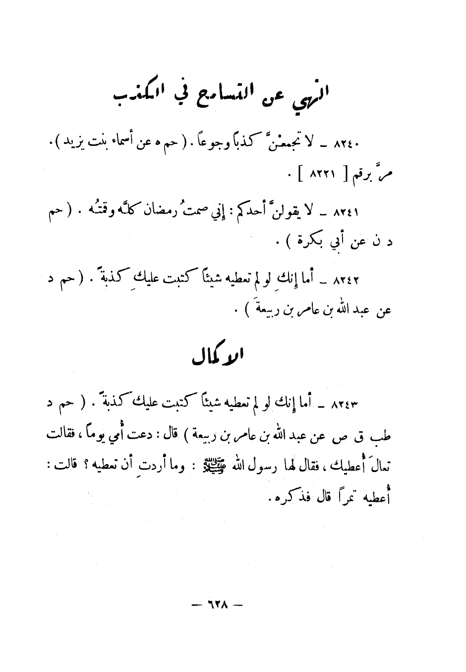 8242- أما إنك لو لم تعطيه شيئا كتبت عليك كذبة. "حم د" عن عبد الله بن عامر بن ربيعة.