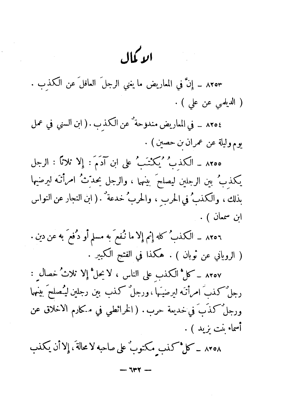8257- كل الكذب على الناس، لا يحل إلا ثلاث خصال: رجل كذب امرأته ليرضيها، ورجل كذب بين رجلين ليصلح بينهما ورجل كذب في خديعة حرب. الخرائطي في مكارم الأخلاق عن أسماء بنت يزيد.