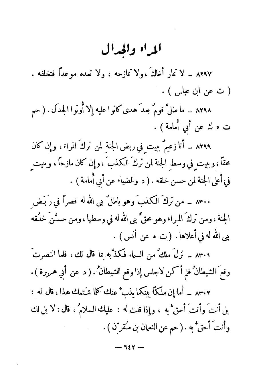 8297- لا تمار أخاك، ولا تمازحه، ولا تعده موعدا فتخلفه. "ت" عن ابن عباس.