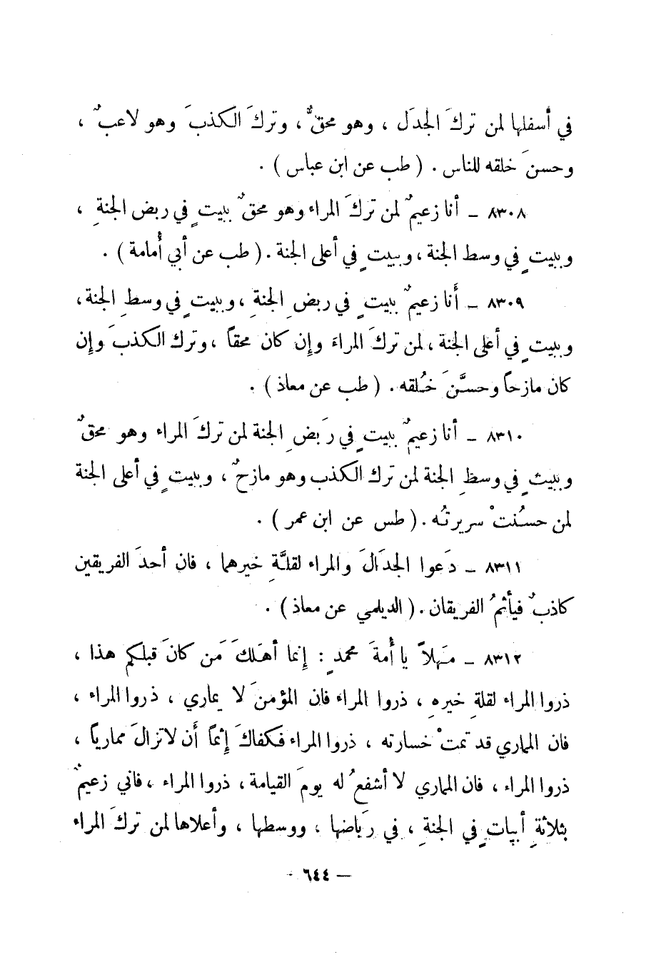 8312- مهلا يا أمة محمد: إنما أهلك من كان قبلكم هذا، ذروا المراء لقلة خيره، ذروا المراء فإن المؤمن لا يماري، ذروا المراء، فإن المماري قد تمت خسارته، ذروا المراء فكفاك إثما أن لا تزال مماريا، ذروا المراء، فإن المماري لا أشفع له يوم القيامة، ذروا المراء، فإني زعيم بثلاثة أبيات في الجنة، في رياضها، ووسطها، وأعلاها لمن ترك المراء