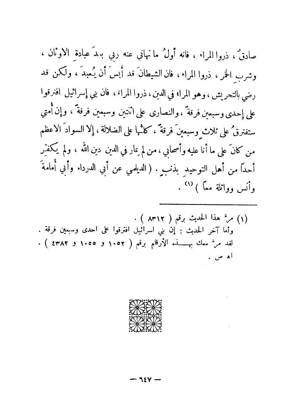 صادق، ذروا المراء، فإنه أول ما نهاني عنه ربي بعد عبادة الأوثان، وشرب الخمر، ذروا المراء، فإن الشيطان قد أيس أن يعبد، ولكن قد رضي بالتحريش، وهو المراء في الدين، ذروا المراء، فإن بني إسرائيل افترقوا على إحدى وسبعين فرقة، والنصارى على اثنتين وسبعين فرقة، وإن أمتي ستفترق على ثلاث وسبعين فرقة، كلها على الضلالة، إلا السواد الأعظم من كان على ما أنا عليه وأصحابي، من لم يمار في الدين دين الله، ولم يكفر أحدا من أهل التوحيد بذنب. الديلمي عن أبي الدرداء وأبي أمامة وأنس وواثلة معا1.