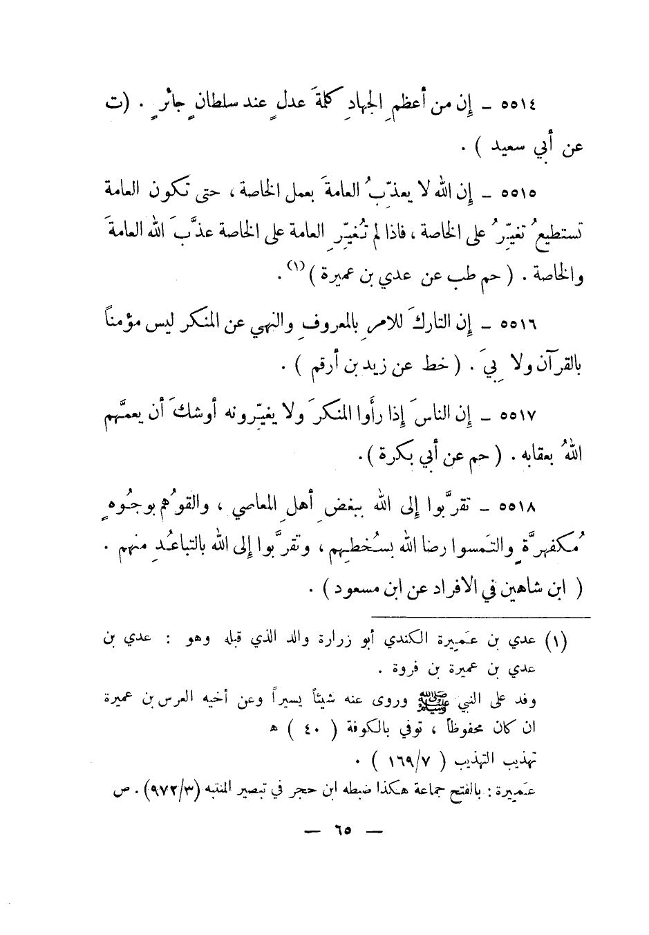 5515- إن الله لا يعذب العامة بعمل الخاصة، حتى تكون العامة تستطيع تغير على الخاصة، فإذا لم تغير العامة على الخاصة عذب الله العامة والخاصة. "حم طب عن عدي بن عميرة"1