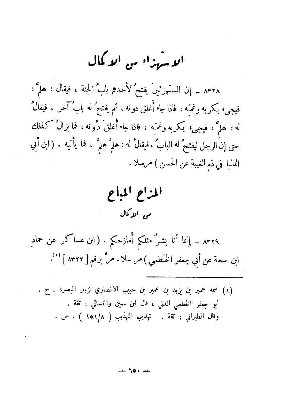 8328- إن المستهزئين يفتح لأحدهم باب الجنة، فيقال: هلم: فيجيء بكربه وغمه، فإذا جاء أغلق دونه، ثم يفتح له باب آخر، فيقال له: هلم، فيجيء بكربه وغمه، فإذا جاء أغلق دونه، فما يزال كذلك حتى إن الرجل ليفتح له الباب، فيقال له: هلم هلم، فما يأتيه. ابن أبي الدنيا في ذم الغيبة عن الحسن مرسلا.