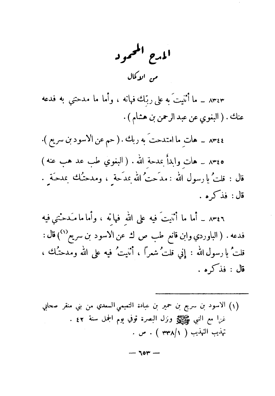8346- أما ما أثنيت فيه على الله فهاته، وأما ما مدحتني فيه فدعه. الباوردي وابن قانع "طب ص ك" عن الأسود بن سريع1 قال: قلت يا رسول الله: إني قلت شعرا، أثنيت فيه على الله ومدحتك، قال: فذكره.