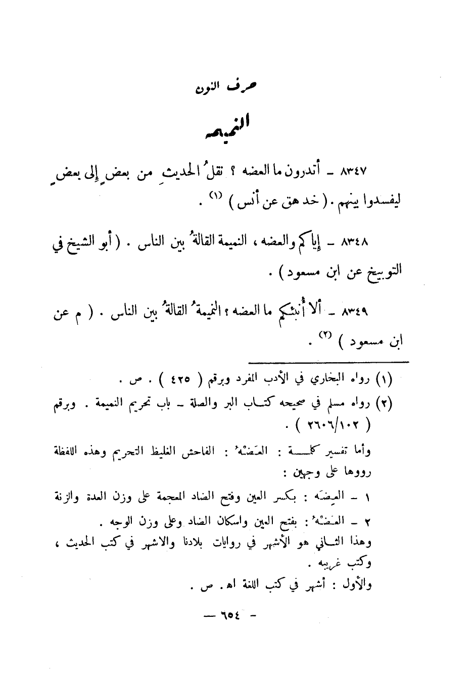 2 رواه مسلم في صحيحه كتاب البر والصلة - باب تحريم النميمة. وبرقم "102/2606". وأما تفسير كلمة: العضه: الفاحش الغليظ التحريم وهذه اللفظة رووها على وجهين: