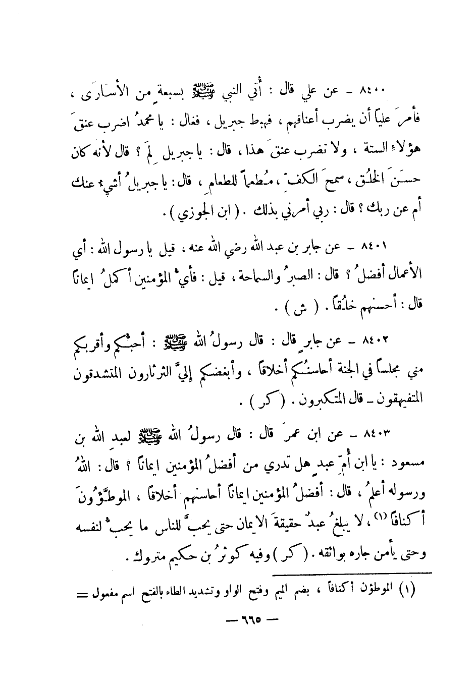 8401- عن جابر بن عبد الله رضي الله عنه، قيل يا رسول الله: أي الأعمال أفضل؟ قال: الصبر والسماحة، قيل: فأي المؤمنين أكمل إيمانا قال: أحسنهم خلقا. "ش".