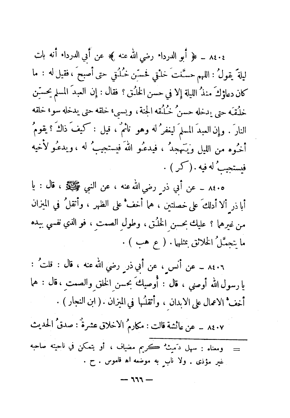 8404- "أبو الدرداء رضي الله عنه" عن أبي الدرداء أنه بات ليلة يقول: اللهم حسنت خلقي فحسن خلقي حتى أصبح، فقيل له: ما كان دعاؤك منذ الليلة إلا في حسن الخلق؟ فقال: إن العبد المسلم يحسن خلقه حتى يدخله حسن خلقه الجنة، ويسيء خلقه حتى يدخله سوء خلقه النار. وإن العبد المسلم ليغفر له وهو نائم، قيل: كيف ذاك؟ يقوم أخوه من الليل ويتهجد، فيدعو الله فيستجيب له، ويدعو لأخيه فيستجيب له فيه. "كر".