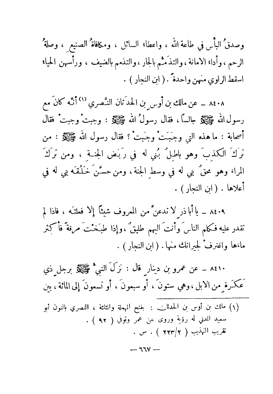 8408- عن مالك بن أوس بن الحدثان النصري1 أنه كان مع رسول الله صلى الله عليه وسلم جالسا، فقال رسول الله صلى الله عليه وسلم: وجبت وجبت فقال أصحابه: ما هذه التي وجبت وجبت؟ فقال رسول الله صلى الله عليه وسلم: من ترك الكذب وهو باطل بني له في ربض الجنة، ومن ترك المراء وهو محق بني له في وسط الجنة، ومن حسن خلقه بني له في أعلاها. ابن النجار.