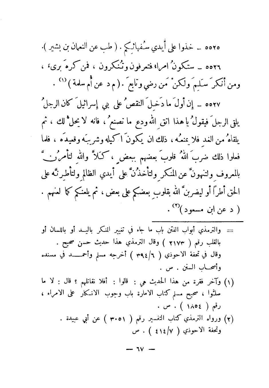 1 وآخر فقرة من هذا الحديث هي: قالوا: أفلا نقاتلهم؟ قال: لا ما صلوا، صحيح مسلم كتاب الإمارة باب وجوب الإنكار على الأمراء، رقم "1854". ص".