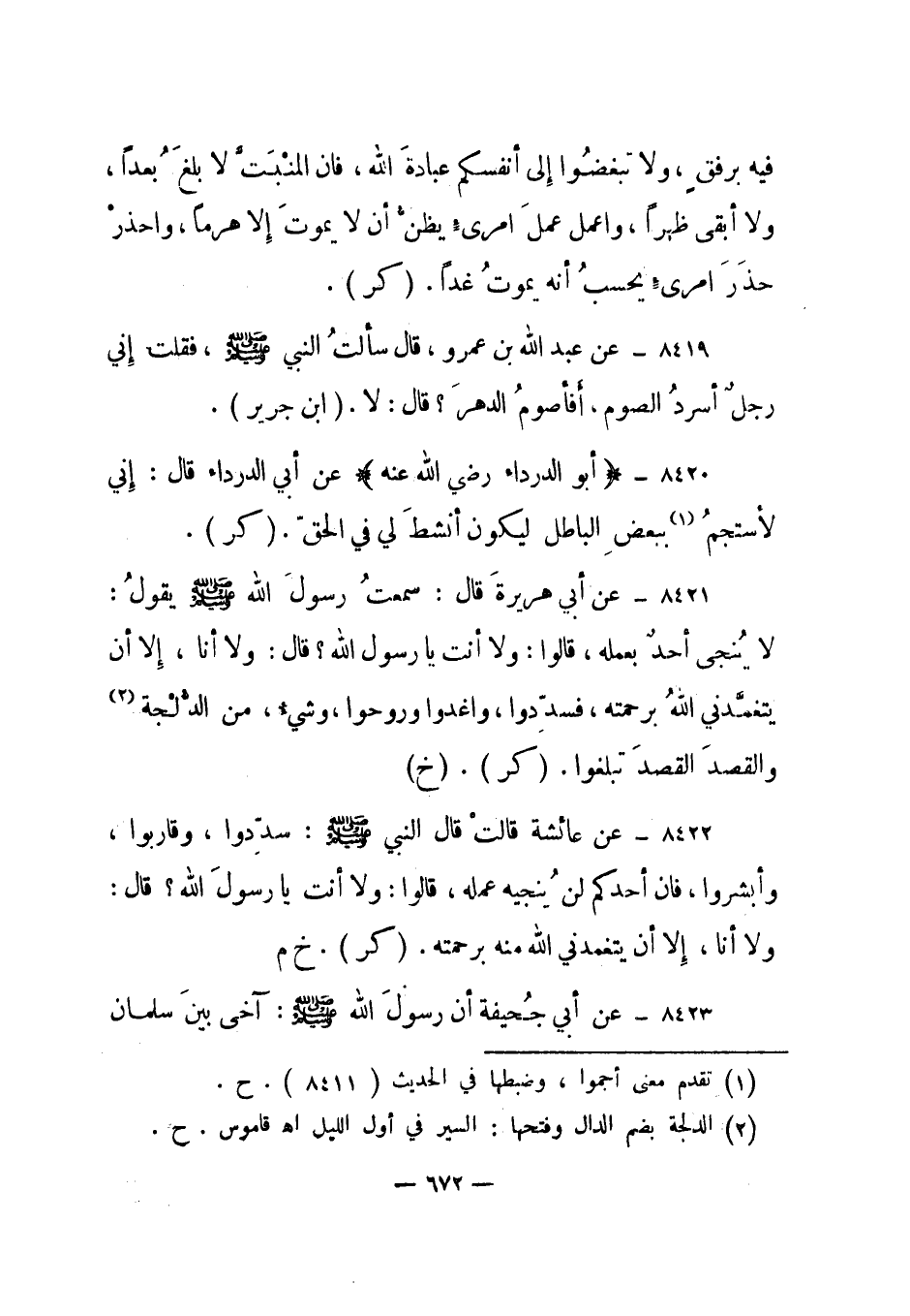 8421- عن أبي هريرة قال: سمعت رسول الله صلى الله عليه وسلم يقول: لا ينجى أحد بعمله، قالوا: ولا أنت يا رسول الله؟ قال: ولا أنا، إلا أن يتغمدني الله برحمته، فسددوا، واغدوا وروحوا، وشيء من الدلجة2 والقصد القصد تبلغوا. "كر". "خ".