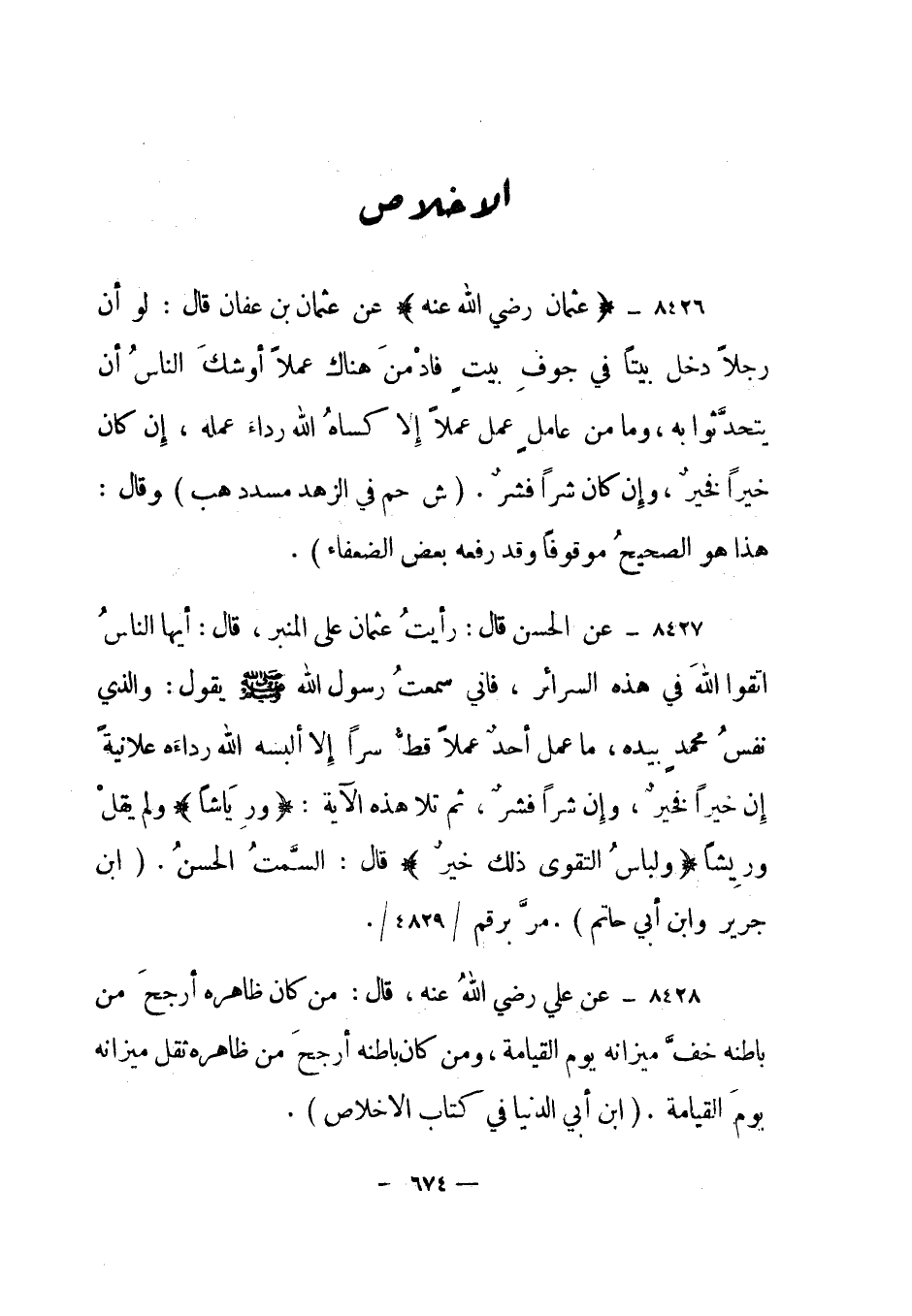 8428- عن علي رضي الله عنه، قال: من كان ظاهره أرجح من باطنه خف ميزانه يوم القيامة، ومن كان باطنه أرجح من ظاهره ثقل ميزانه يوم القيامة. ابن أبي الدنيا في كتاب الإخلاص.
