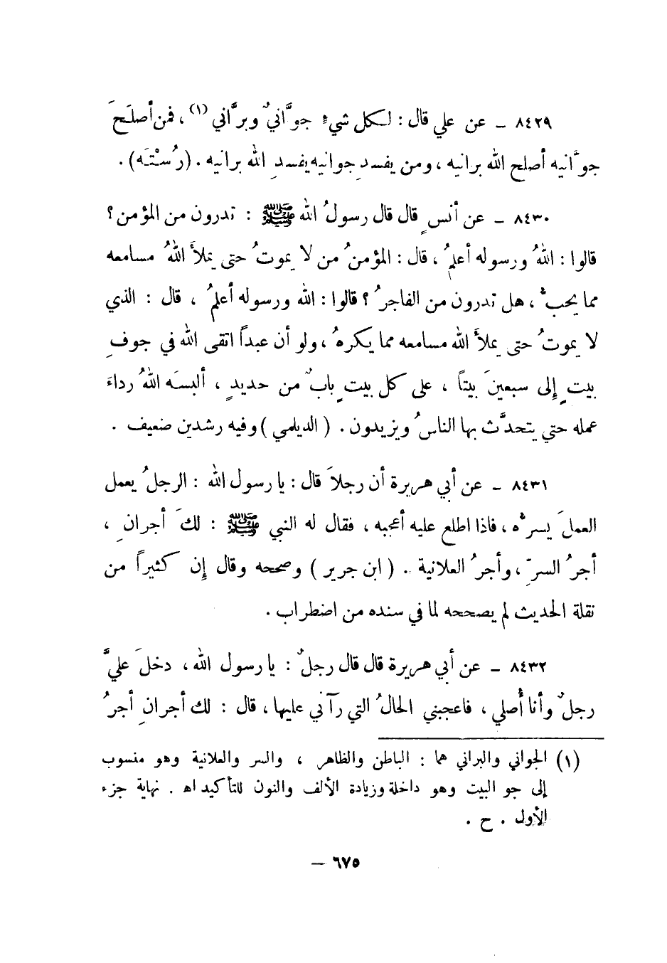 8431- عن أبي هريرة أن رجلا قال: يا رسول الله: الرجل يعمل العمل يسره، فإذا اطلع عليه أعجبه، فقال له النبي صلى الله عليه وسلم: لك أجران، أجر السر، وأجر العلانية. ابن جرير، وصححه وقال إن كثيرا من نقلة الحديث لم يصححه لما في سنده من اضطراب.
