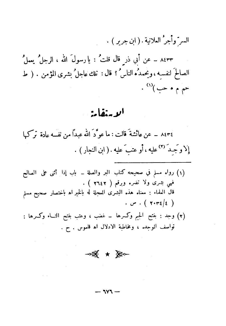 8433- عن أبي ذر قال قلت: يا رسول الله، الرجل يعمل الصالح لنفسه، ويحمده الناس؟ قال: تلك عاجل بشرى المؤمن. "ط حم هـ حب"1.