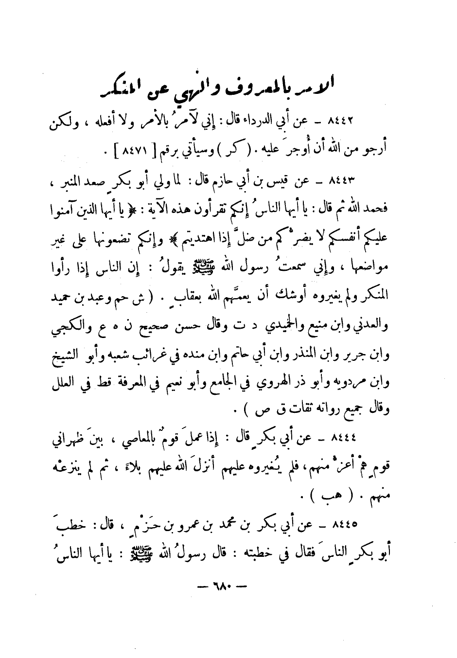 8443- عن قيس بن أبي حازم قال: لما ولي أبو بكر صعد المنبر، فحمد الله ثم قال: يا أيها الناس إنكم تقرأون هذه الآية: {يَا أَيُّهَا الَّذِينَ آمَنُوا عَلَيْكُمْ أَنْفُسَكُمْ لا يَضُرُّكُمْ مَنْ ضَلَّ إِذَا اهْتَدَيْتُمْ} وإنكم تضعونها على غير مواضعها، وإني سمعت رسول الله صلى الله عليه وسلم يقول: إن الناس إذا رأوا المنكر ولم يغيروه أوشك أن يعمهم الله بعقاب. "ش حم" وعبد بن حميد والعدني وابن منيع والحميدي "د ت" وقال حسن صحيح "ن هـ ع" والكجي وابن جريروابن المنذر وابن أبي حاتم وابن منده في غرائب شعبه وأبو الشيخ وابن مردويه وأبو ذر الهروي في الجامع وأبو نعيم في المعرفة "قط" في العلل وقال جميع رواته ثقات "ق ص".