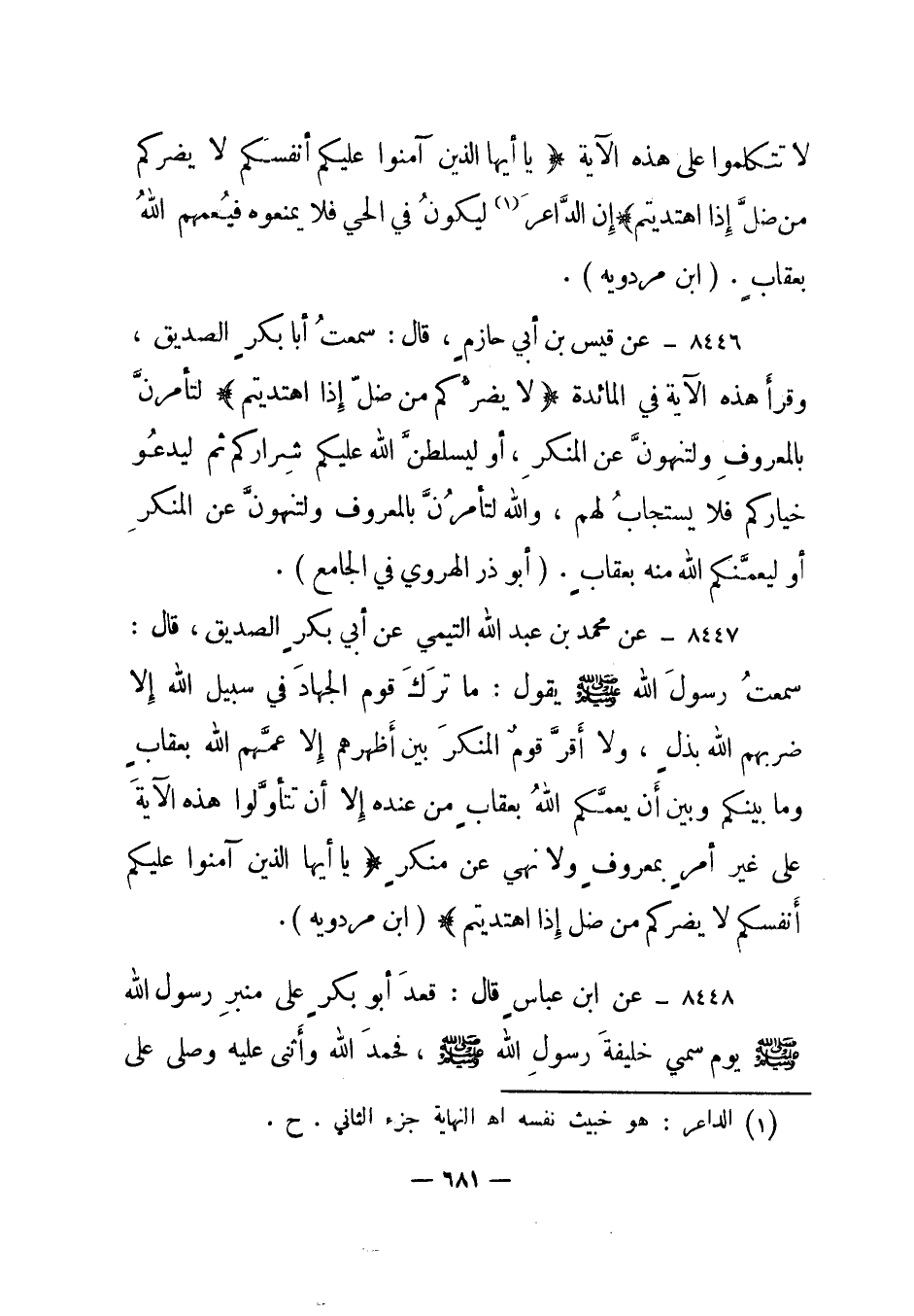8446- عن قيس بن أبي حازم، قال: سمعت أبا بكر الصديق، وقرأ هذه الاية في المائدة {لا يَضُرُّكُمْ مَنْ ضَلَّ إِذَا اهْتَدَيْتُمْ} لتأمرن بالمعروف ولتنهون عن المنكر، أو ليسلطن الله عليكم شراركم ثم ليدعو خياركم فلا يستجاب لهم، والله لتأمرن بالمعروف ولتنهون عن المنكر أو ليعمنكم الله منه بعقاب. أبو ذر الهروي في الجامع.