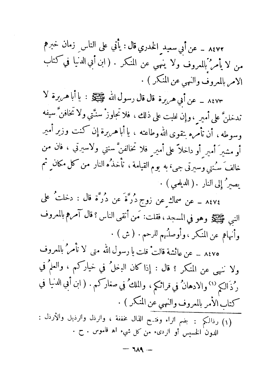 8472- عن أبي سعيد الخدري قال: يأتي على الناس زمان خيرهم من لا يأمر بالمعروف ولا ينهى عن المنكر. ابن أبي الدنيا في كتاب الأمر بالمعروف والنهي عن المنكر.