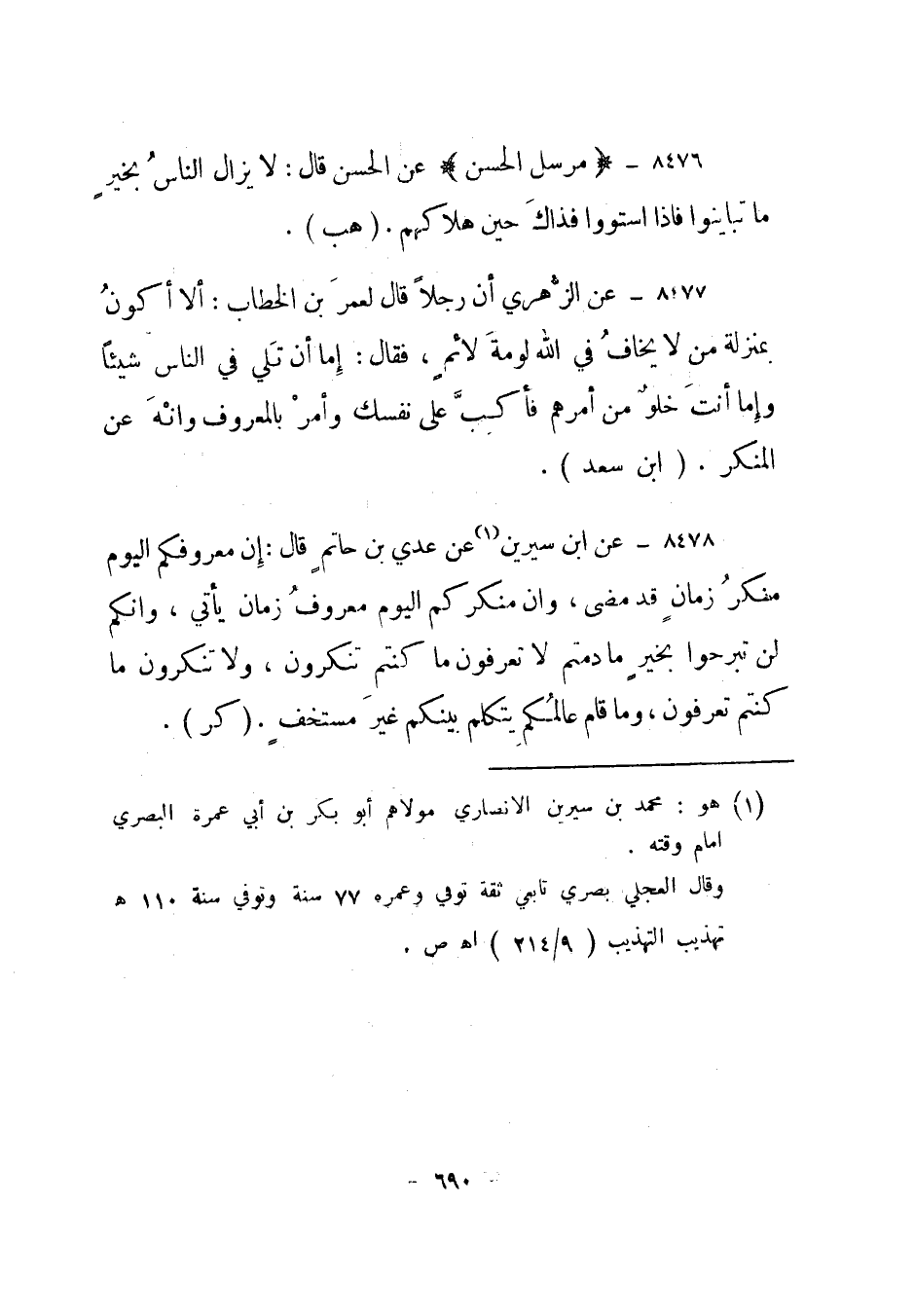 8478- عن ابن سيرين1 عن عدي بن حاتم قال: إن معروفكم اليوم منكر زمان قد مضى، وإن منكركم اليوم معروف زمان يأتي، وإنكم لن تبرحوا بخير ما دمتم لا تعرفون ما كنتم تنكرون، ولا تنكرون ما كنتم تعرفون، وما قام عالمكم يتكلم بينكم غير مستخف. "كر".