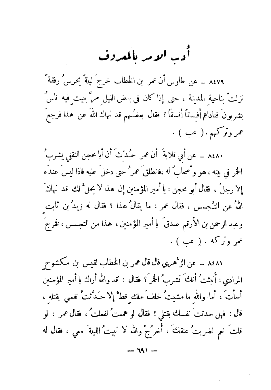 8480- عن أبي قلابة أن عمر حدث أن أبا محجن الثقفي يشرب الخمر في بيته، هو وأصحاب له، فانطلق عمر حتى دخل عليه فإذا ليس عنده إلا رجل، فقال أبو محجن: يا أمير المؤمنين إن هذا لا يحل لك قد نهاك الله عن التجسس، فقال عمر: ما يقال هذا؟ فقال له زيد بن ثابت وعبد الرحمن بن الأرقم صدق يا أمير المؤمنين، هذا من التجسس، فخرج عمر وتركه. "عب".