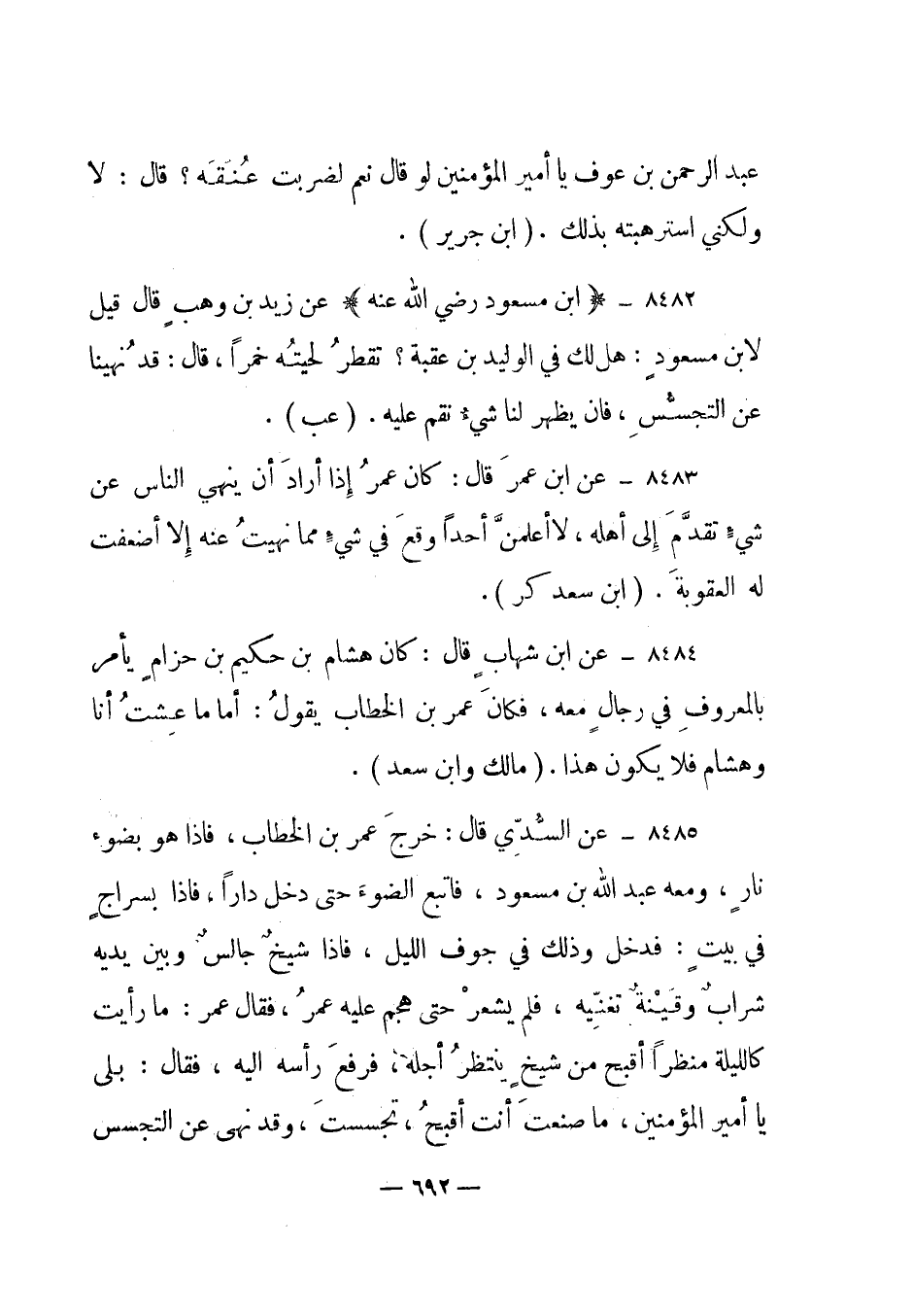 8482- "ابن مسعود رضي الله عنه" عن زيد بن وهب قال قيل لابن مسعود: هل لك في الوليد بن عقبة؟ تقطر لحيته خمرا، قال: قد نهينا عن التجسس، فإن يظهر لنا شيء نقم عليه. "عب".