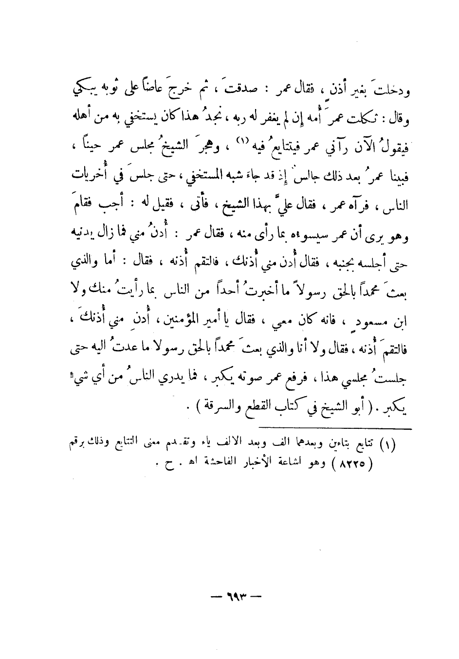 ودخلت بغير أذن، فقال عمر: صدقت، ثم خرج عاضا على ثوبه يبكي وقال: ثكلت عمر أمه إن لم يغفر له ربه، نجد هذا كان يستخفي به من أهله فيقول الآن رآني عمر فيتتايع فيه1 وهجر الشيخ مجلس عمر حينا، فبينا عمر بعد ذلك جالس إذ قد جاء شبه المستخفي، حتى جلس في أخريات الناس، فرآه عمر، فقال علي بهذا الشيخ، فأتى، فقيل له: أجب فقام وهو يرى أن عمر سيسوءه بما رأى منه، فقال عمر: أدن مني فما زال يدنيه حتى أجلسه بجنبه، فقال أدن مني أذنك، فالتقم أذنه، فقال: أما والذي بعث محمدا بالحق رسولا ما أخبرت أحدا من الناس بما رأيت منك ولا ابن مسعود، فإنه كان معي، فقال يا أمير المؤمنين، أدن مني أذنك، فالتقم أذنه، فقال ولا أنا والذي بعث محمدا بالحق رسولا ما عدت إليه حتى جلست مجلسي هذا، فرفع عمر صوته يكبر، فما يدري الناس من أي شيء يكبر. أبو الشيخ في كتاب القطع والسرقة.
