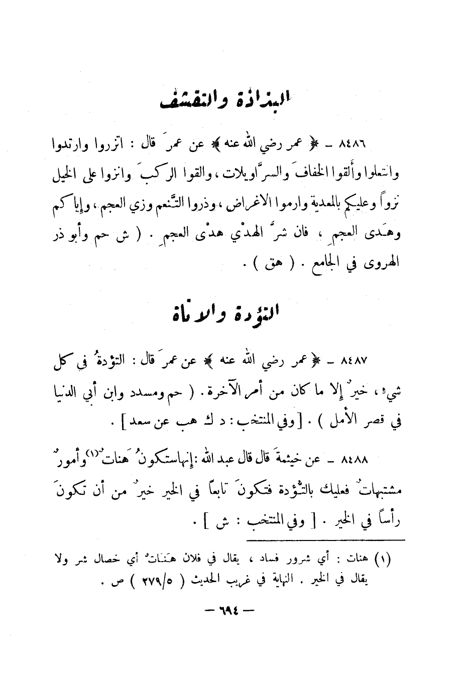 8488- عن خثيمة قال قال عبد الله: إنها ستكون هنات1 وأمور مشتبهات فعليك بالتؤدة فتكون تابعا في الخير خير من أن تكون رأسا في الخير. وفي المنتخب: "ش".