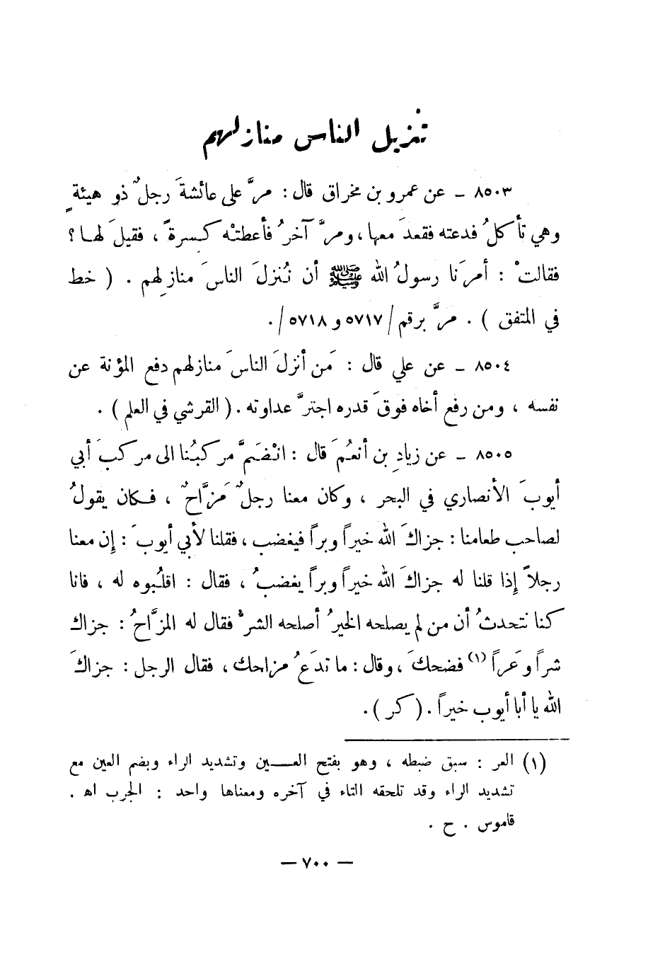 8503- عن عمرو بن مخراق قال: مر على عائشة رجل ذو هيئة وهي تأكل فدعته فقعد معها، ومر آخر فأعطته كسرة، فقيل لها؟ فقالت: أمرنا رسول الله صلى الله عليه وسلم أن ننزل الناس منازلهم.