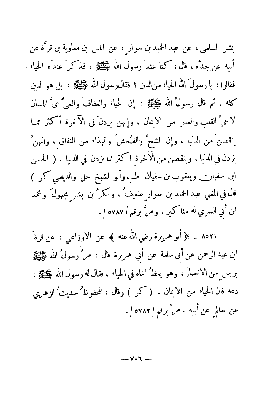 8521- "أبو هريرة رضي الله عنه" عن الأوزاعي: عن قرة بن عبد الرحمن عن أبي سلمة عن أبي هريرة قال: مر رسول الله صلى الله عليه وسلم برجل من الأنصار، وهو يعظ أخاه في الحياء، فقال له رسول الله صلى الله عليه وسلم: دعه فإن الحياء من الإيمان. "كر" وقال: المحفوظ حديث الزهري عن سالم عن أبيه. مر برقم /5782/.