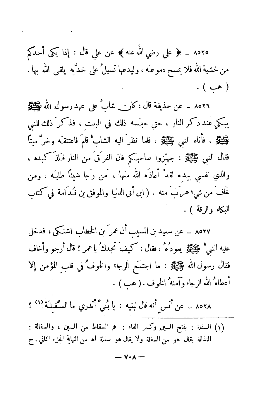 8526- عن حذيفة قال: كان شاب على عهد رسول الله صلى الله عليه وسلم يبكي عند ذكر النار، حتى حبسه ذلك في البيت، فذكر ذلك للنبي صلى الله عليه وسلم، فأتاه النبي صلى الله عليه وسلم، فلما نظر إليه الشاب قام فاعتنقه وخر ميتا فقال النبي صلى الله عليه وسلم: جهزوا صاحبكم فإن الفرق من النار فلذ كبده، والذي نفسي بيده لقد أعاذه الله منها، من رجا شيئا طلبه، ومن خاف من شيء هرب منه. ابن أبي الدنيا والموفق بن قدامة في كتاب البكاء والرقة.