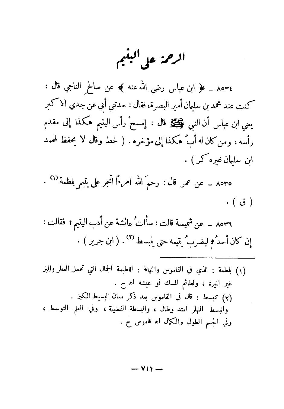 8536- عن شميسة قالت: سألت عائشة عن أدب اليتيم؟ فقالت: إن كان أحدهم ليضرب يتيمه حتى ينبسط2. ابن جرير.
