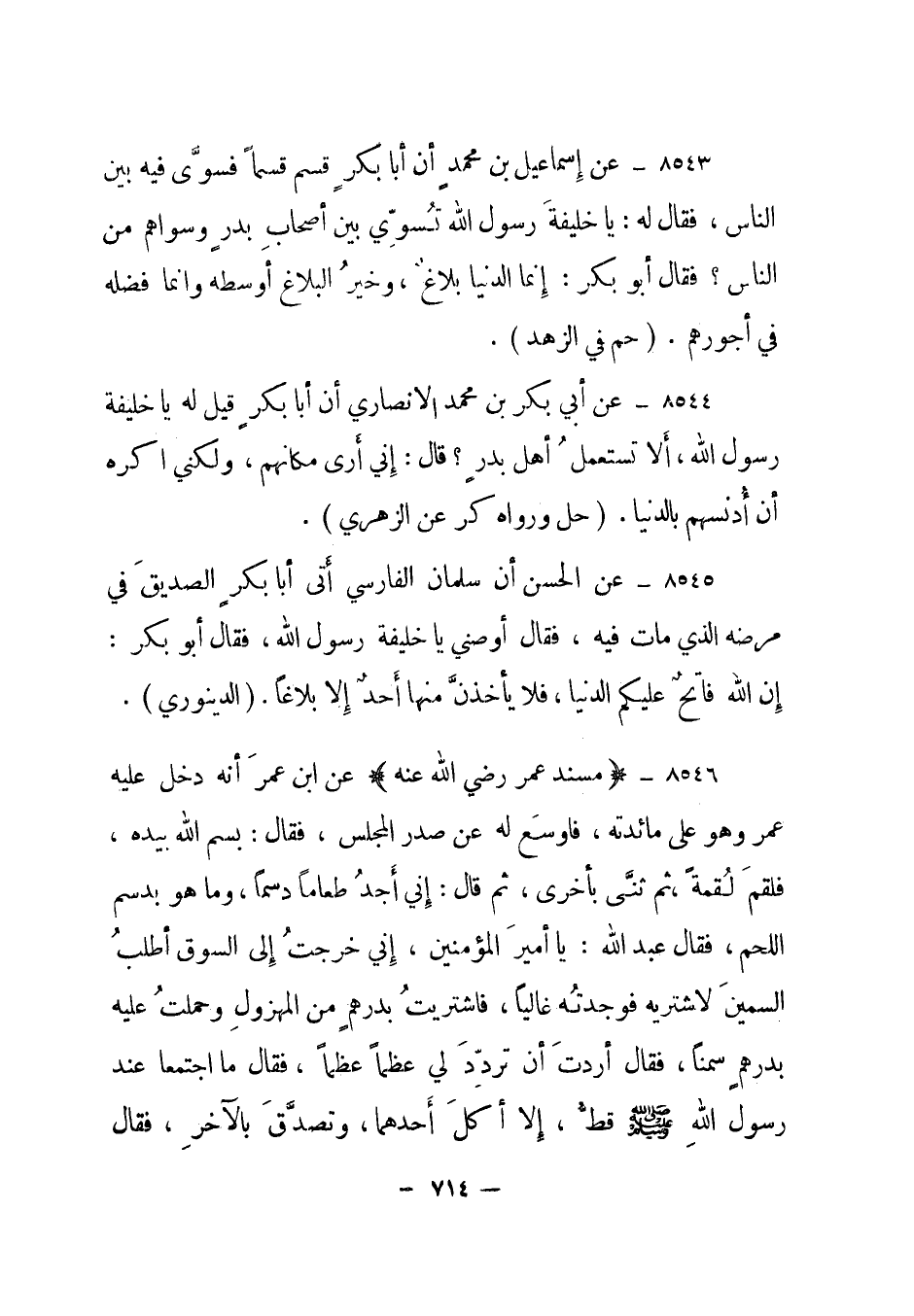 8543- عن إسماعيل بن محمد أن أبا بكر قسم قسما فسوى فيه بين الناس، فقال له: يا خليفة رسول الله تسوي بين أصحاب بدر وسواهم من الناس؟ فقال أبو بكر: إنما الدنيا بلاغ، وخير البلاغ أوسطه وإنما فضله في أجورهم. "حم" في الزهد.