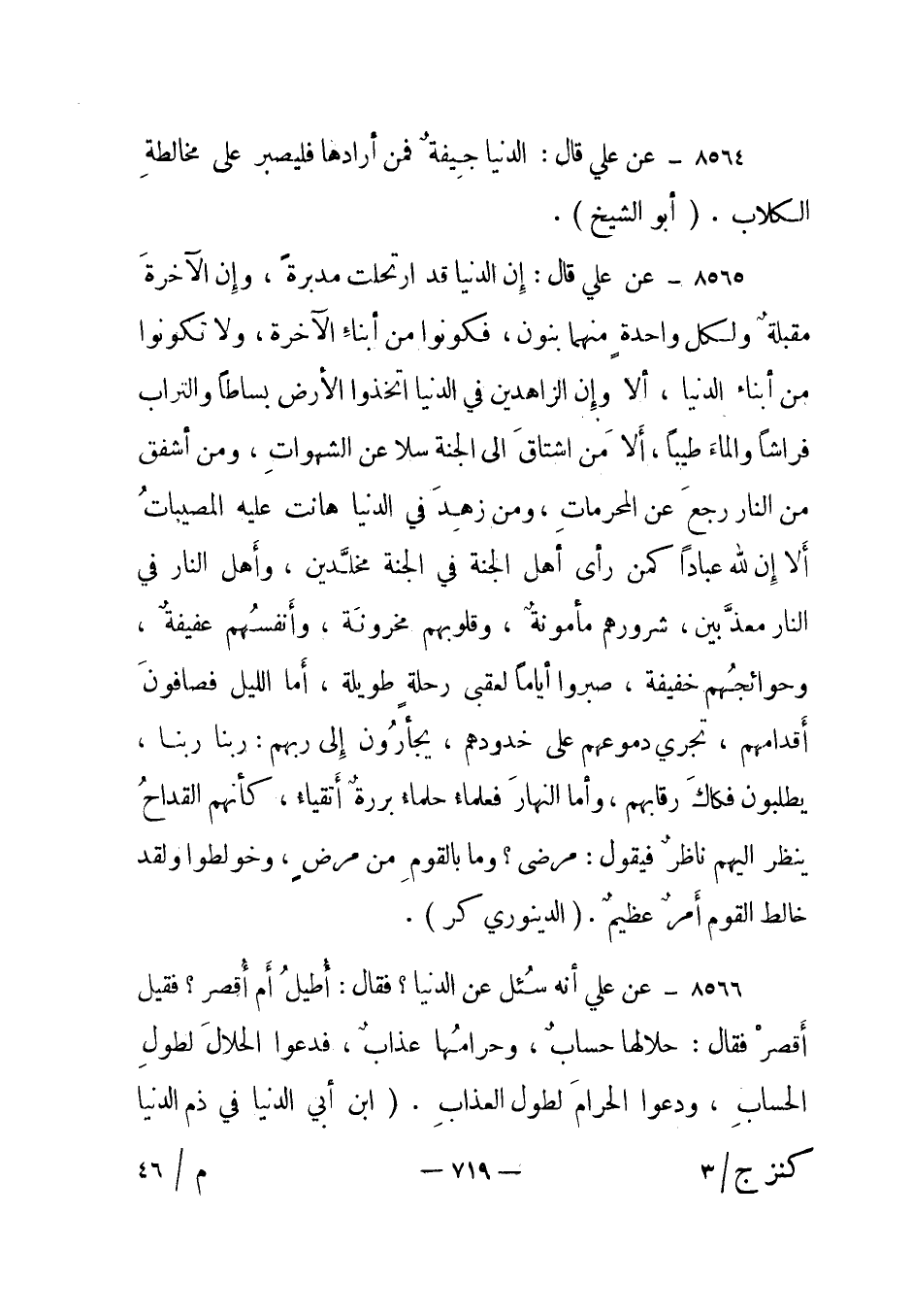 8566- عن علي أنه سئل عن الدنيا؟ فقال: أطيل أم أقصر؟ فقيل أقصر فقال: حلالها حساب، وحرامها عذاب، فدعوا الحلال لطول الحساب، ودعوا الحرام لطول العذاب. ابن أبي الدنيا في ذم الدنيا