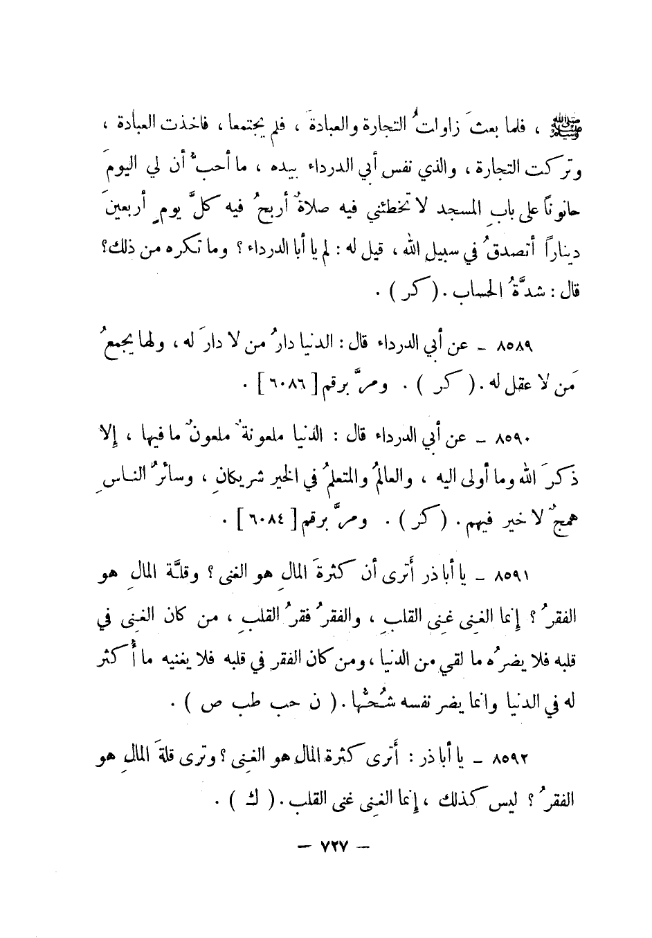8591- يا أبا ذر أترى أن كثرة المال هو الغنى؟ وقلة المال هو الفقر؟ إنما الغنى غنى القلب، والفقر فقر القلب، من كان الغنى في قلبه فلا يضره ما لقي من الدنيا، ومن كان الفقر في قلبه فلا يغنيه ما أكثر له في الدنيا وإنما يضر نفسه شحها. "ن حب طب ص".