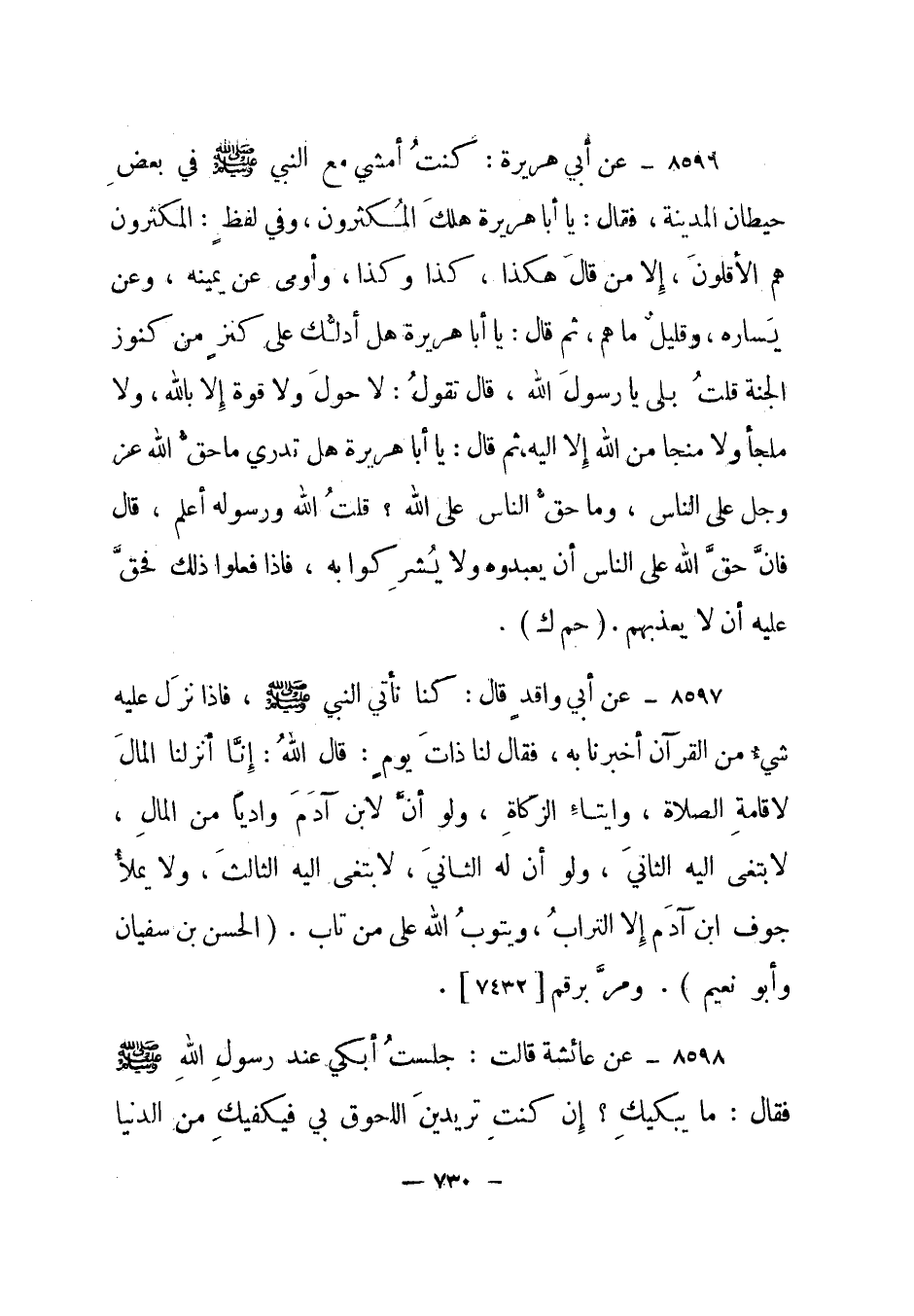 8598- عن عائشة قالت: جلست أبكي عند رسول الله صلى الله عليه وسلم فقال: ما يبكيك؟ إن كنت تريدين اللحوف بي فيكفيك من الدنيا