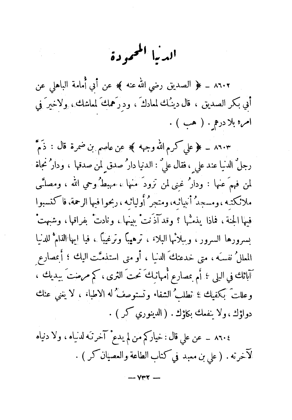 8603- "علي كرم الله وجهه" عن عاصم بن ضمرة قال: ذم رجل الدنيا عند علي، فقال علي: الدنيا دار صدق لمن صدقها، ودار نجاة لمن فهم عنها: ودار غنى لمن تزود منها، مهبط وحي الله، ومصلى ملائكته، ومسجد أنبيائه، ومتجر أوليائه، ربحوا فيها الرحمة، فاكتسبوا فيها الجنة، فماذا يذمها؟ وقد آذنت ببينها، ونادت بفراقها، وشبهت بسرورها السرور، وببلائها البلاء، ترهيبا وترغيبا، فيا أيها الذام للدنيا المعلل نفسه، متى خدعتك الدنيا، أو متى استذمت إليك؛ أبمصارع آبائك في البلى؛ أم بمصارع أمهاتك تحت الثرى، كم مرضت بيديك، وعللت بكفيك؛ تطلب الشفاء وتستوصف له الأطباء، لا يغني عنك دواؤك، ولا ينفعك بكاؤك. الدينوري "كر".