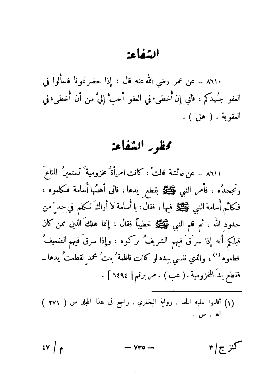 8611- عن عائشة قالت: كانت امرأة مخزومية تستعير المتاع وتجحده، فأمر النبي صلى الله عليه وسلم بقطع يدها، فأتى أهلها أسامة فكلموه، فكلم أسامة النبي صلى الله عليه وسلم فيها، فقال: يا أسامة لا أراك تكلم في حد من حدود الله، ثم قام النبي صلى الله عليه وسلم خطيبا فقال: إنما هلك الذين ممن كان قبلكم أنه إذا سرق فيهم الشريف تركوه، وإذا سرق فيهم الضعيف قطعوه1 والذي نفسي بيده لو كانت فاطمة بنت محمد لقطعت يدها - فقطع يد المخزومية. "عب". مر برقم [6494] .