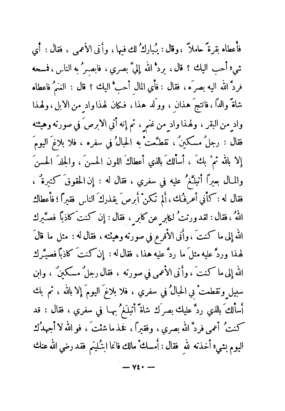 فأعطاه بقرة حاملا، وقال: يبارك لك فيها، وأتى الأعمى، فقال: أي شيء أحب إليك؟ قال، يرد الله إلي بصري، فأبصر به الناس، فمسحه فرد الله إليه بصره، فقال: فأي المال أحب إليك؟ قال: الغنم فأعطاه شاة والدا، فأنتج هذان، وولد هذا، فكان لهذا واد من الإبل، ولهذا واد من البقر، ولهذا واد من غنم، ثم إنه أتي الأبرص في صورته وهيئته فقال: رجل مسكين، تقطعت به الحبال في سفره، فلا بلاغ اليوم إلا بالله ثم بك، أسألك بالذي أعطاك اللون الحسن، والجلد الحسن والمال بعيرا أتبلغ عليه في سفري، فقال له: إن الحقوق كثيرة، فقال له: كأني أعرفك، ألم تكن أبرص يقذرك الناس فقيرا؛ فأعطاك الله، فقال: لقد ورثت لكابر عن كابر، فقال: إن كنت كاذبا فصيرك الله إلى ما كنت، وأتى الأقرع في صورته وهيئته، فقال له: مثل ما قال لهذا ورد عليه مثل ما رد عليه هذا، فقال له: إن كنت كاذبا فصيرك الله إلى ما كنت، وأتى الأعمى في صورته، فقال رجل مسكين، وابن سبيل وتقطعت بي الحبال في سفري، فلا بلاغ اليوم إلا بالله، ثم بك أسألك بالذي رد عليك بصرك شاة أتبلغ بها في سفري، فقال: قد كنت أعمى فرد الله بصري، وفقيرا، فخذ ما شئت، فوالله لا أجهدك اليوم بشيء أخذته لله فقال: أمسك مالك فإنما ابتليتم فقد رضي الله عنك