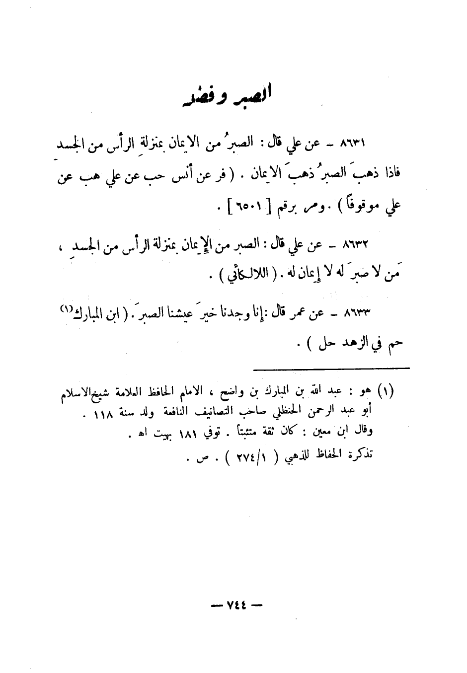 8632- عن علي قال: الصبر من الإيمان بمنزلة الرأس من الجسد، من لا صبر له لا إيمان له. اللالكائي.