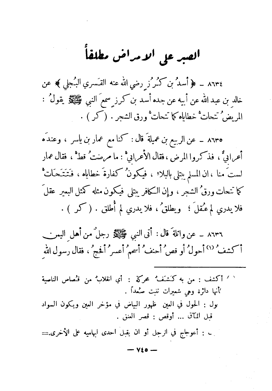 8634- "أسد بن كرز رضي الله عنه القسري البجلي" عن خالد بن عبد الله عن أبيه عن جده أسد بن كرز سمع النبي صلى الله عليه وسلم يقول: المريض تتحات خطاياه كما تتحات ورق الشجر. "كر".
